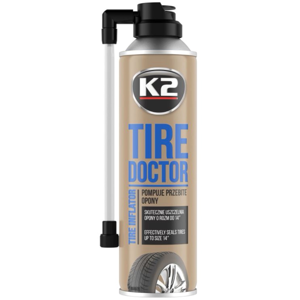 K2 Tire Doktor szybko i skutecznie pompuje i uszczelnia przebite opony – tymczasowa naprawa bez demontażu i użycia narzędzi. Aerozol pompuje oponę, a specjalna lateksowa formuła uszczelnia dziurę. Preparat nie wpływa na wyważenie koła. Pompuje opony do rozmiaru 14″.