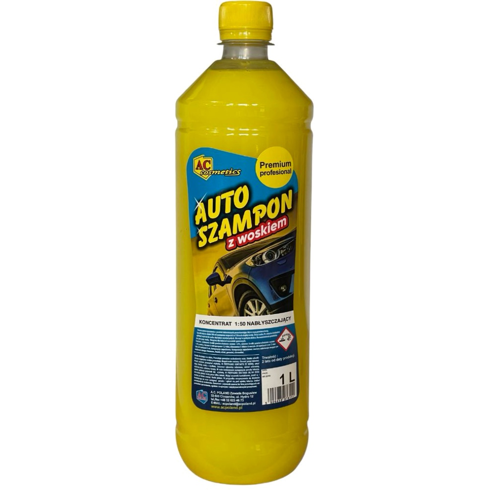 AUTOSZAMPON Z WOSKIEM koncentrat żółty: Koncentrat 1:50. Flagowy produkt produkowany od roku 2000 przez A.C.Poland pod logo AC cosmetics. Skutecznie usuwa zanieczyszczenia z powłok lakierniczych pozostawiając trwałą, woskową warstwę ochronną, chroniącą przed działaniem czynników atmosferycznych. Z powodzeniem stosowany nawet przez odbiorców sprzedających w Autoryzowanych Fabrycznych salonach nowe i używane pojazdy.